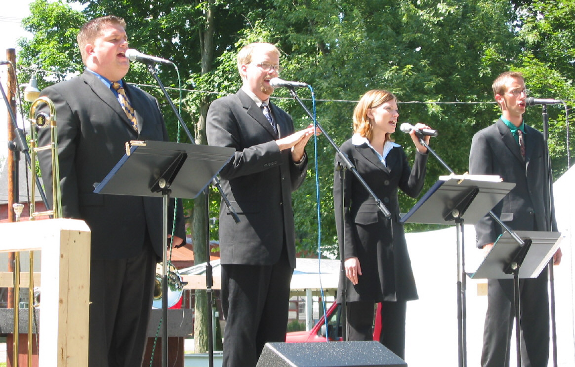 | We have assembled some of our favorite photos for your enjoyment. Please click on any individual photo if you would like to view it at a larger size. If you have a favorite shot of the group that you would like to submit, we would be happy to post it here! | 4-part harmony! Great crowd at Alden Randy belts out a part Now for Carl to give it a try Wells Family pickin' Odosagih Bible Conference 2006 The Whisnants put their hearts into it! Jill Kelly, wife of our favorite Buffalo Bill joined Flash of Brass for a ladies night Flash performing on TV 2006 Flash of Brass group shot 2005 Flash of Brass group shot Flash of Brass Christmas in Batavia, NY - 2004 Flash debuts at Mountain Depot - Gerry, NY on August, 2004. Flash of Brass in rural Chautauqua County, NY On stage July 10 at Elba High School performing a new brass number, Daddy Sang Bass! Judy Martin from The Martins performed at LaborDaze 2004 Flash of Brass opened for Judy Martin on 9/5/04 at Oakfield Labor Daze! |